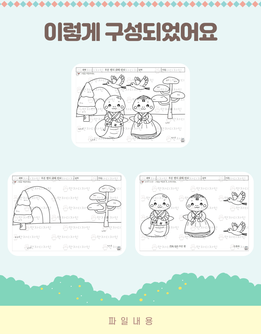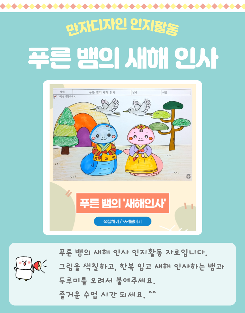 푸른 뱀, 새해 인사, 소나무, 두루미, 새해, 명절, 색칠하기, 설날 활동지, 우리나라 인지활동, 미술수업