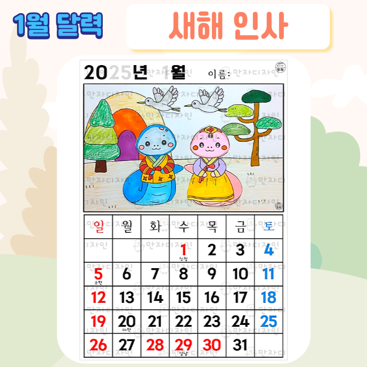 1월 달력, 새해 인사, 설날 달력, 푸른뱀 활동지, 소나무, 두루미, 달력 만들기, 색칠하기, 미술수업, 겨울 인지활동