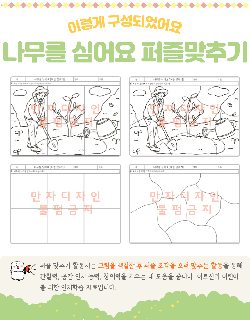 나무, 나무를 심어요, 식목일, 퍼즐, 퍼즐맞추기, 색칠하기, 봄 인지활동, 봄 활동지, 미술수업, 치매예방, 어르신수업,시각인지력