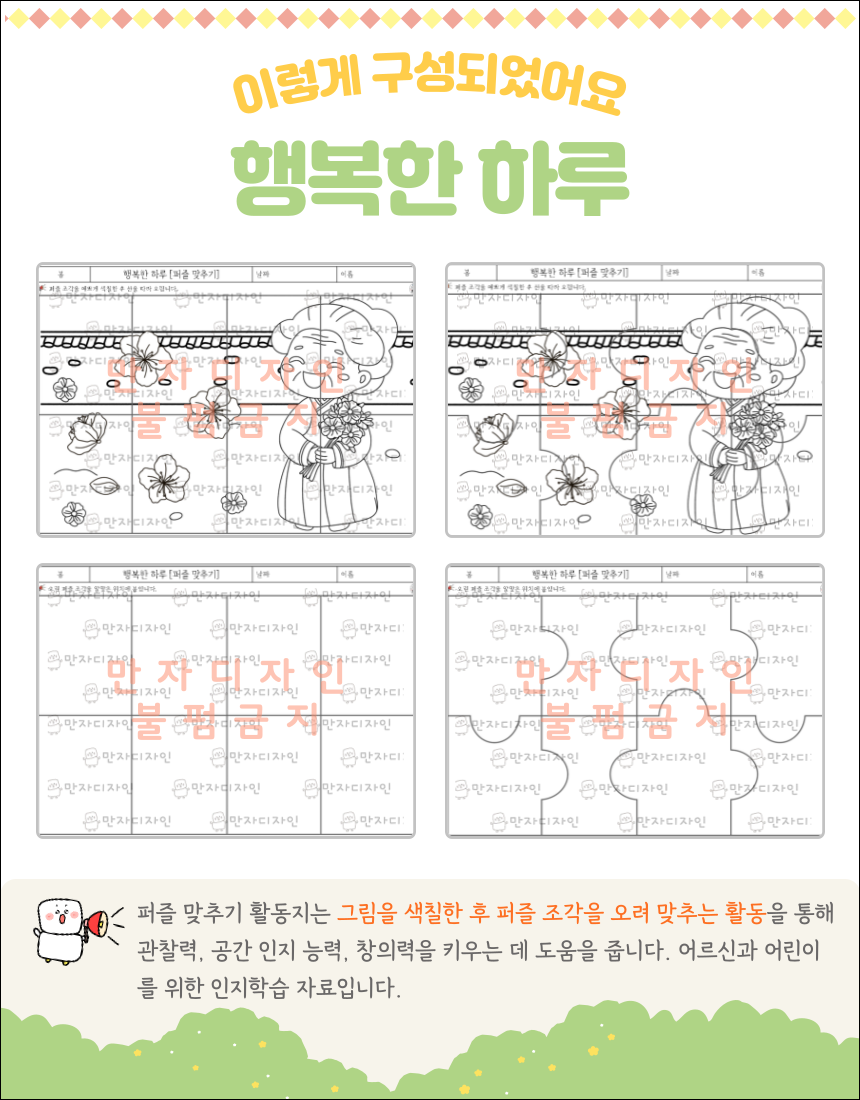 꽃길, 행복한 하루,퍼즐, 퍼즐맞추기, 색칠하기, 봄 인지활동, 봄 활동지, 미술수업, 치매예방, 어르신수업,시각인지력