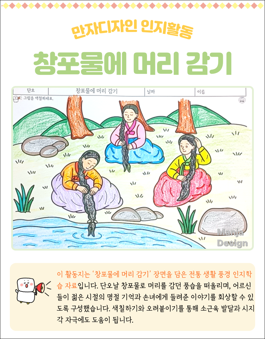 #치매예방활동 #인지활동지 #전통문화교육 #단오날 #창포물머리감기 #색칠공부 #오려붙이기활동 #어르신활동 #복지센터프로그램 #부모님선물