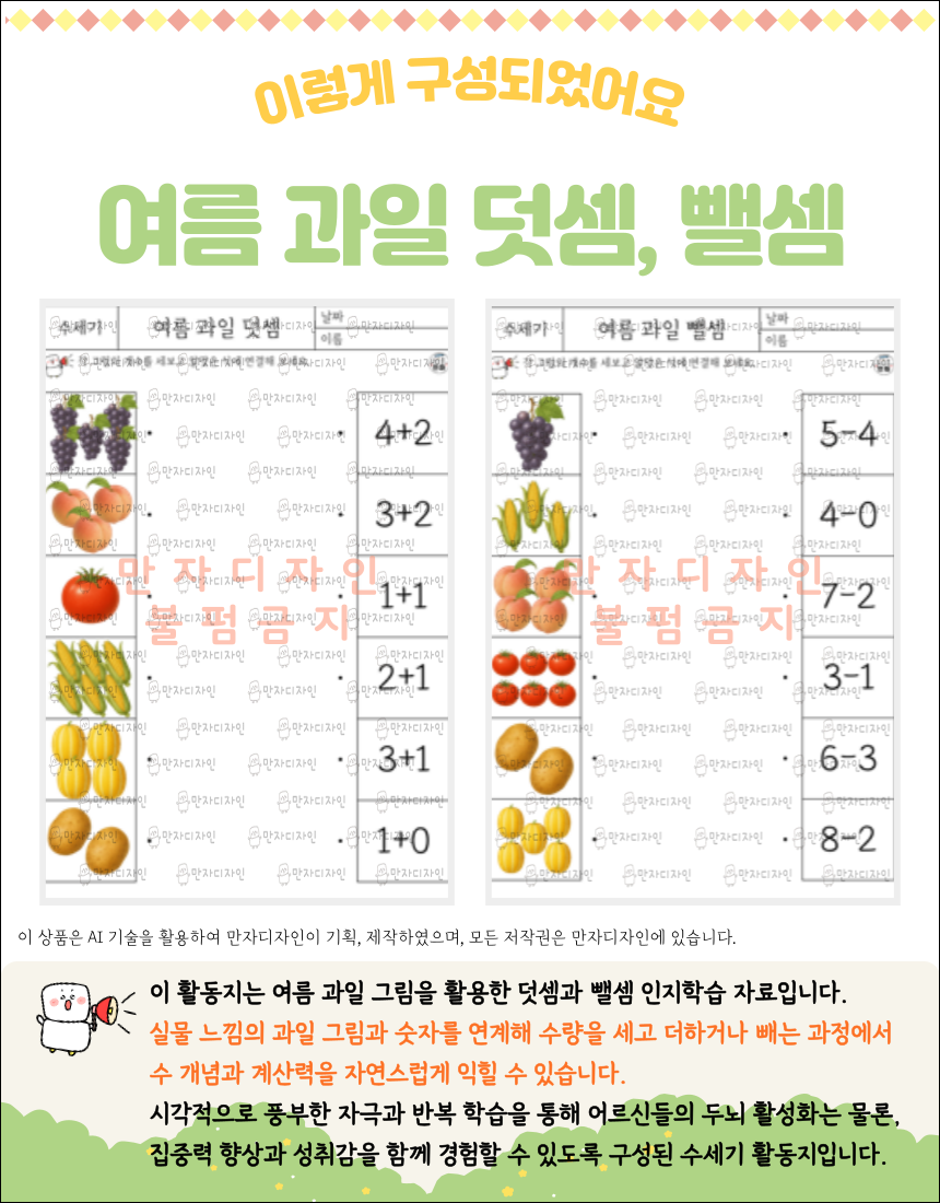 #치매예방 #수세기활동 #덧셈뺄셈학습지 #인지활동지 #수개념훈련 #어르신활동지  #과일학습 #집중력놀이 #노인수학놀이