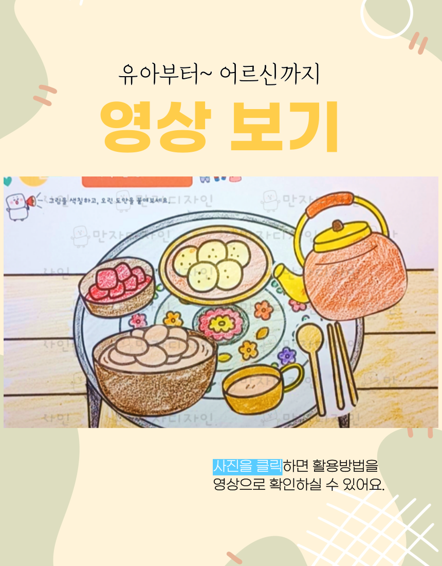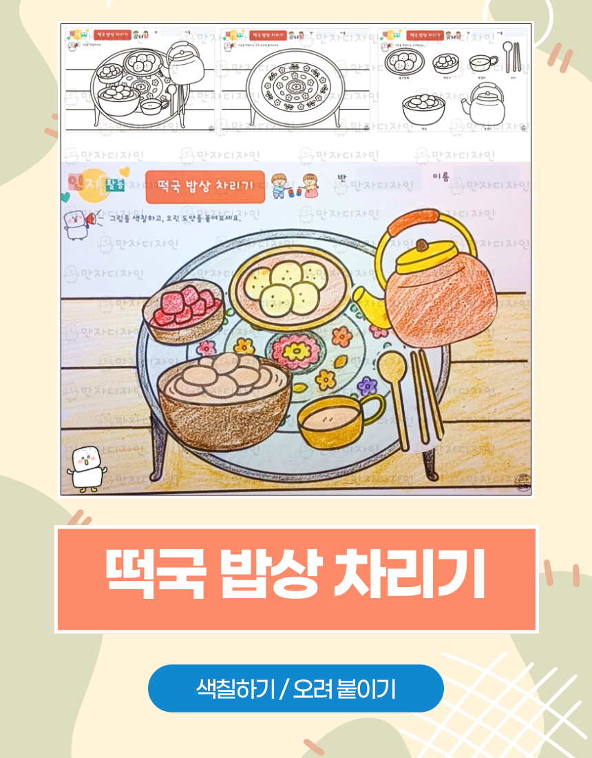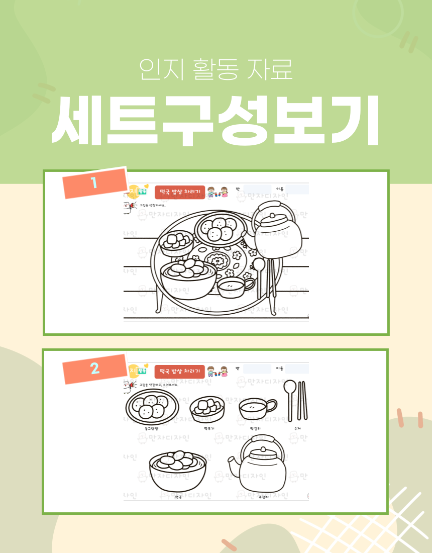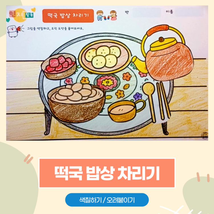 인지활동, 인지학습지, 설날 활동지, 명절활동지, 떡국 밥상차리기, 떡국 색칠하기,  옛날밥상, 양은밥상, 주전자, 미술수업, 인지활동자료