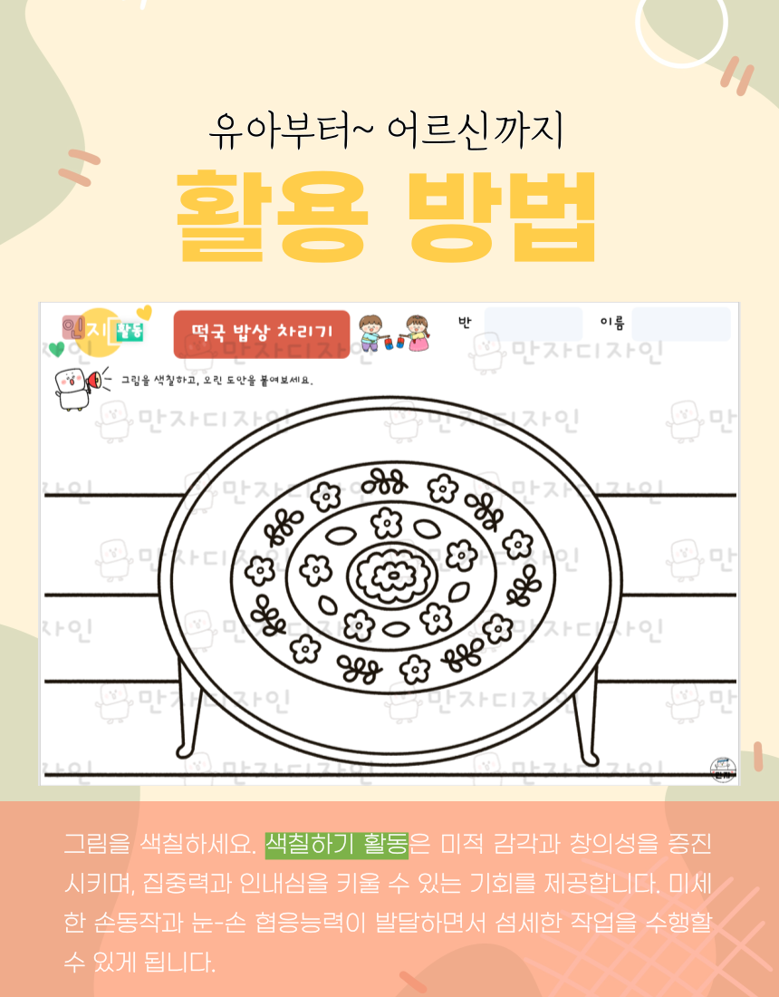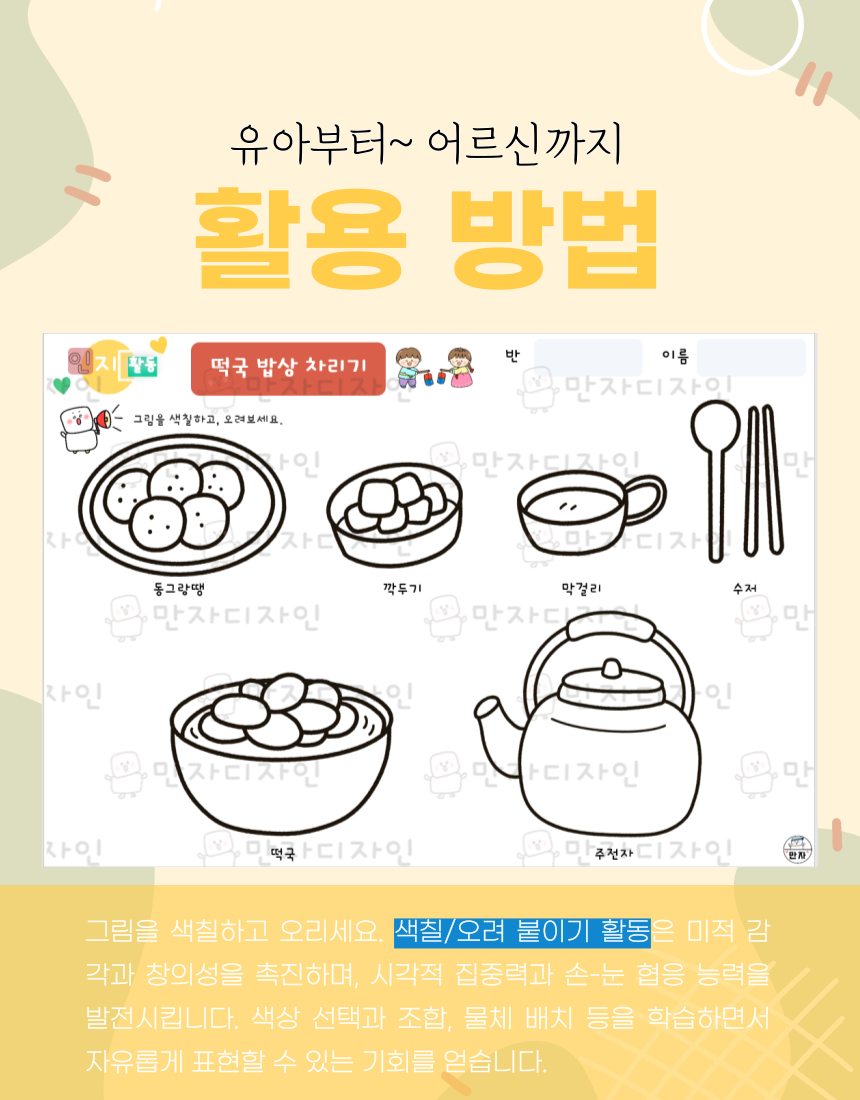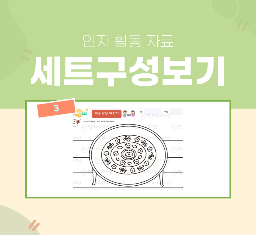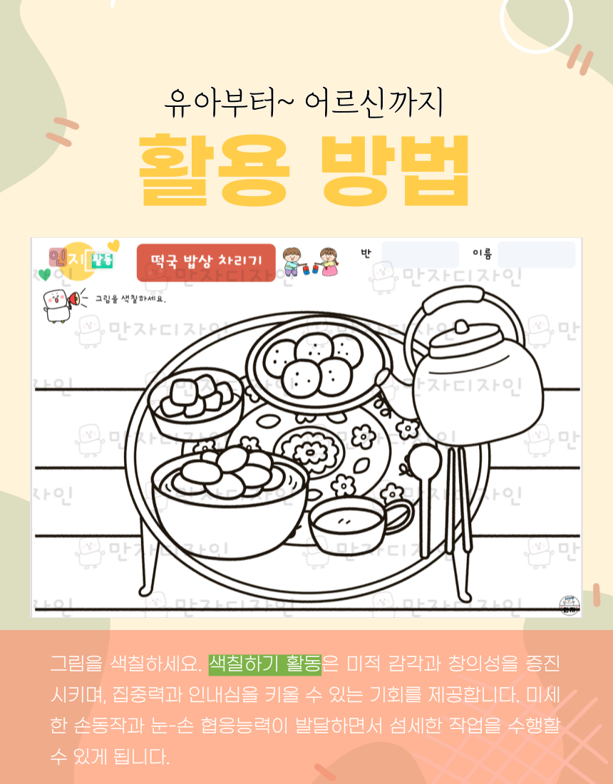 인지활동, 인지학습지, 설날 활동지, 명절활동지, 떡국 밥상차리기, 떡국 색칠하기,  옛날밥상, 양은밥상, 주전자, 미술수업, 인지활동자료
