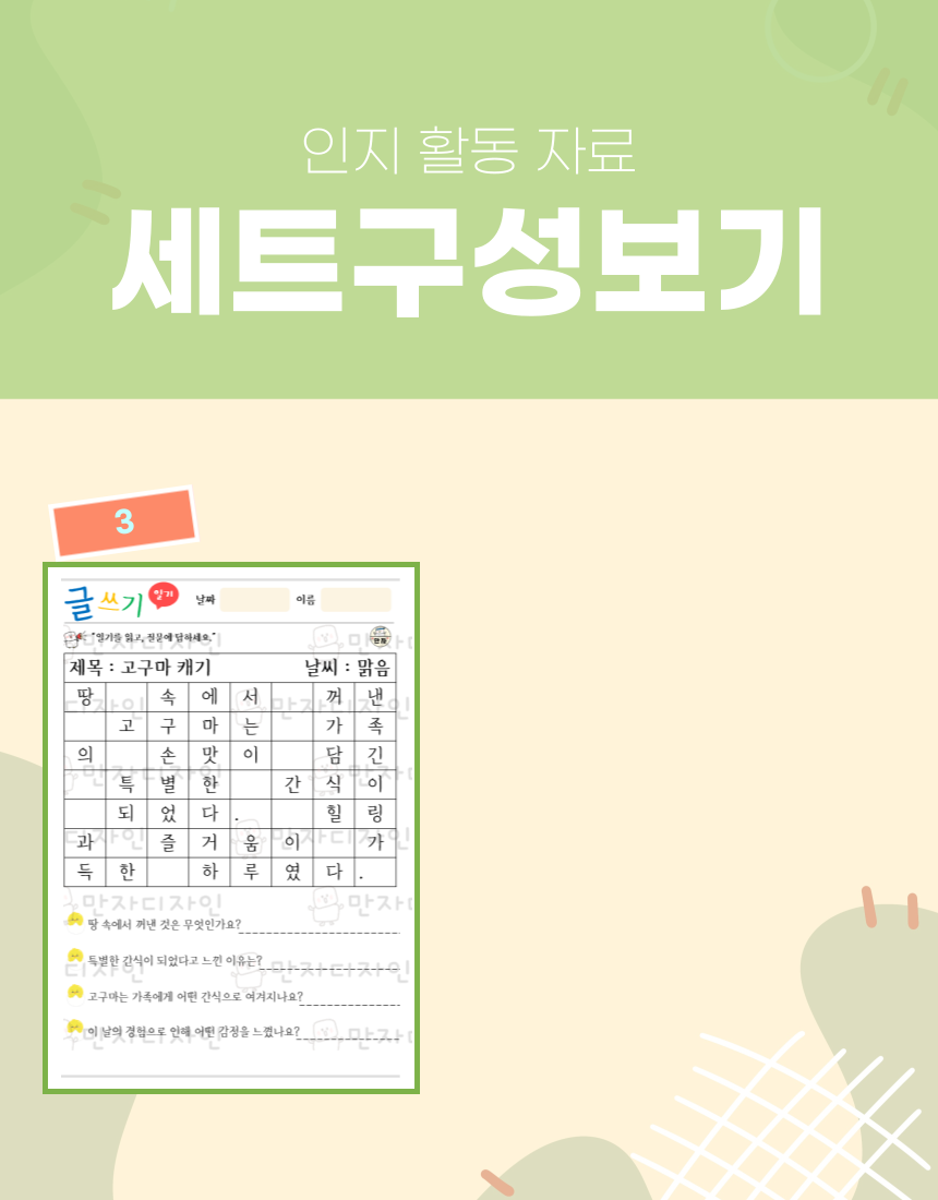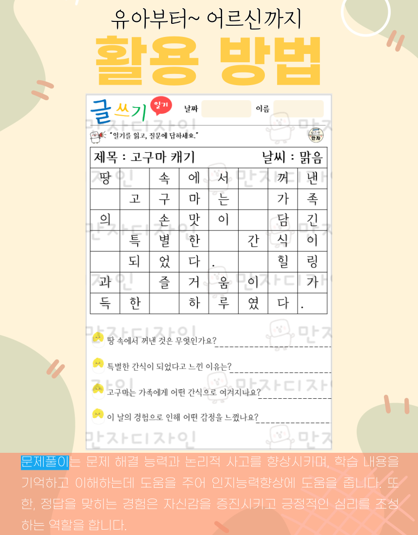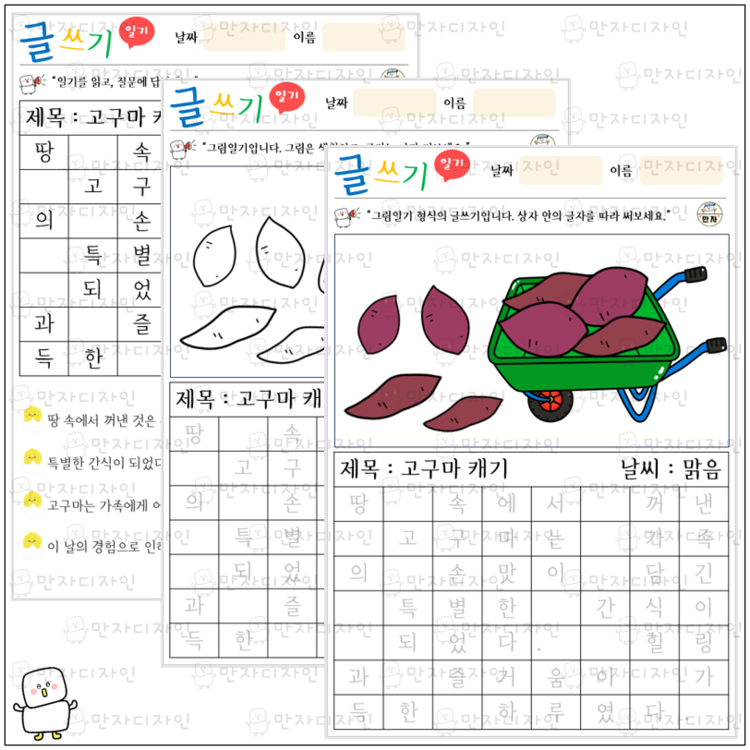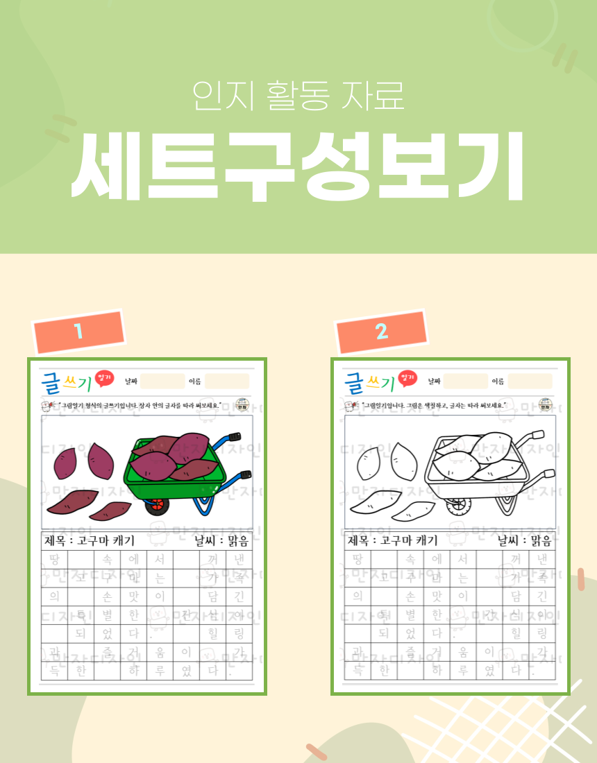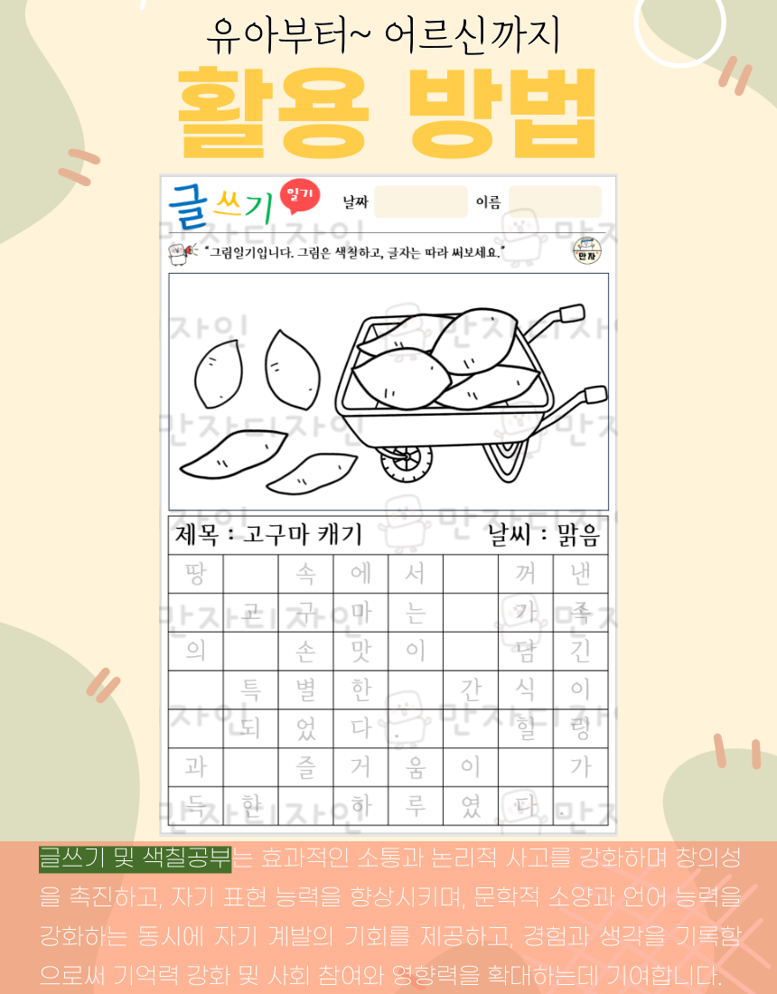 일기쓰기, 글쓰기, 따라쓰기, 한글공부, 인지활동자료, 인지학습지, 한글학습지, 색칠공부, 문제풀이, 고구마캐기, 고구마색칠하기