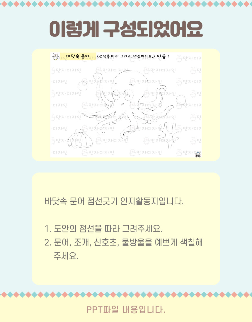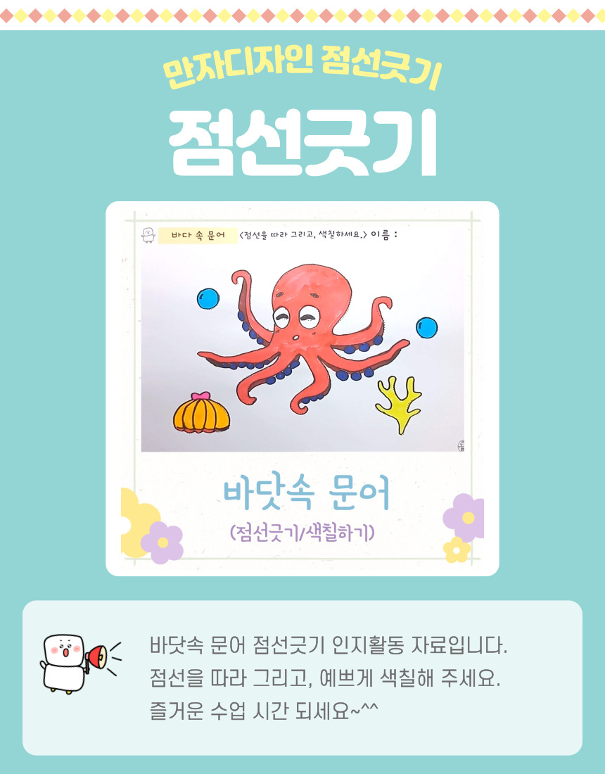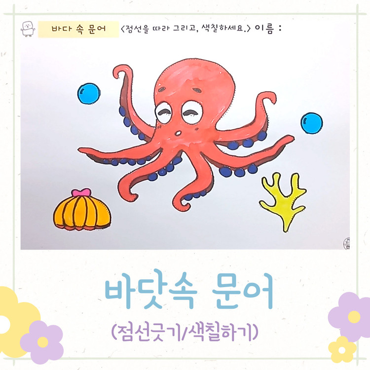 문어 색칠하기, 바닷속 문어, 조개, 산호초, 물방울, 여름 색칠하기, 점선긋기, 여름활동지, 여름 인지활동, 미술수업