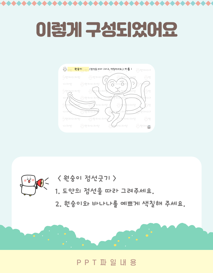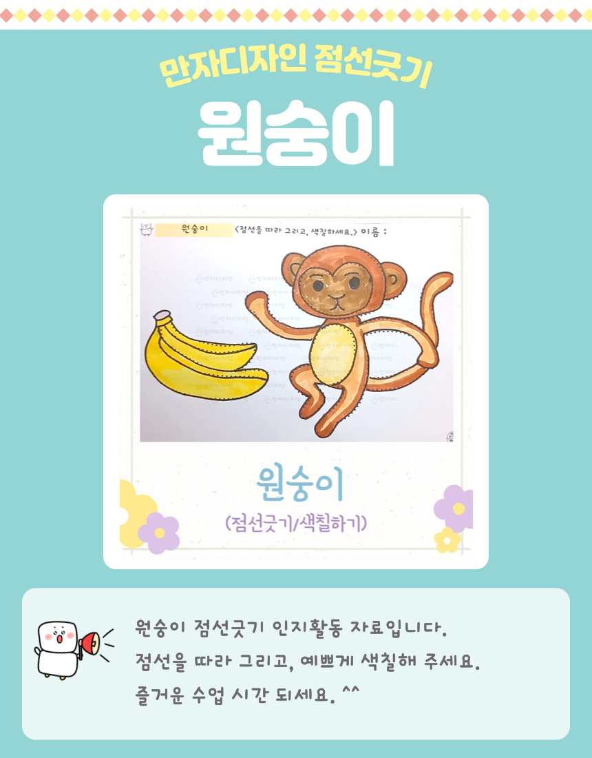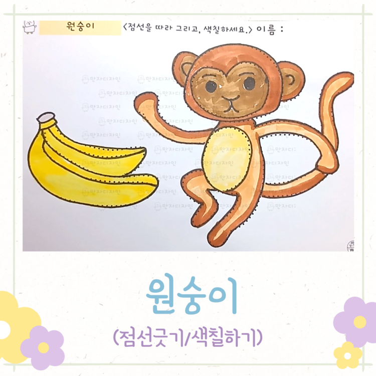 원숭이 색칠하기, 바나나, 원숭이 도안, 점선긋기, 동물 활동지, 동물 인지활동, 미술수업