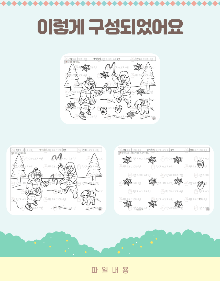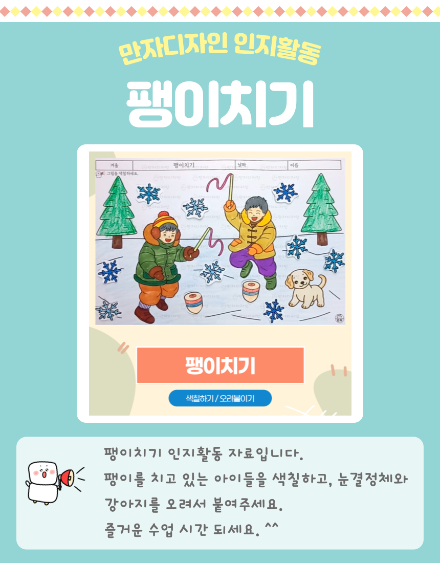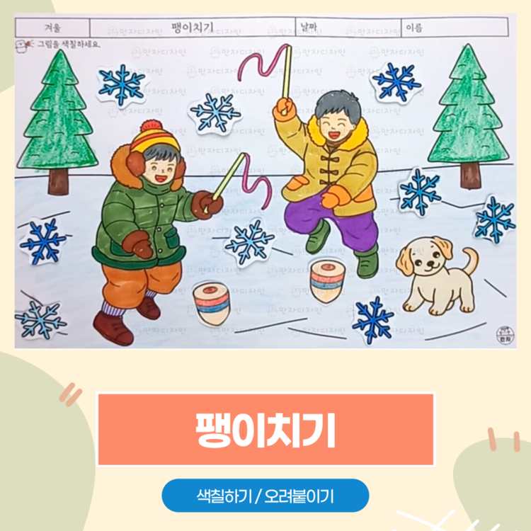 팽이치기, 겨울놀이, 강아지, 눈결정체, 색칠하기, 겨울 활동지, 겨울 인지활동, 미술수업