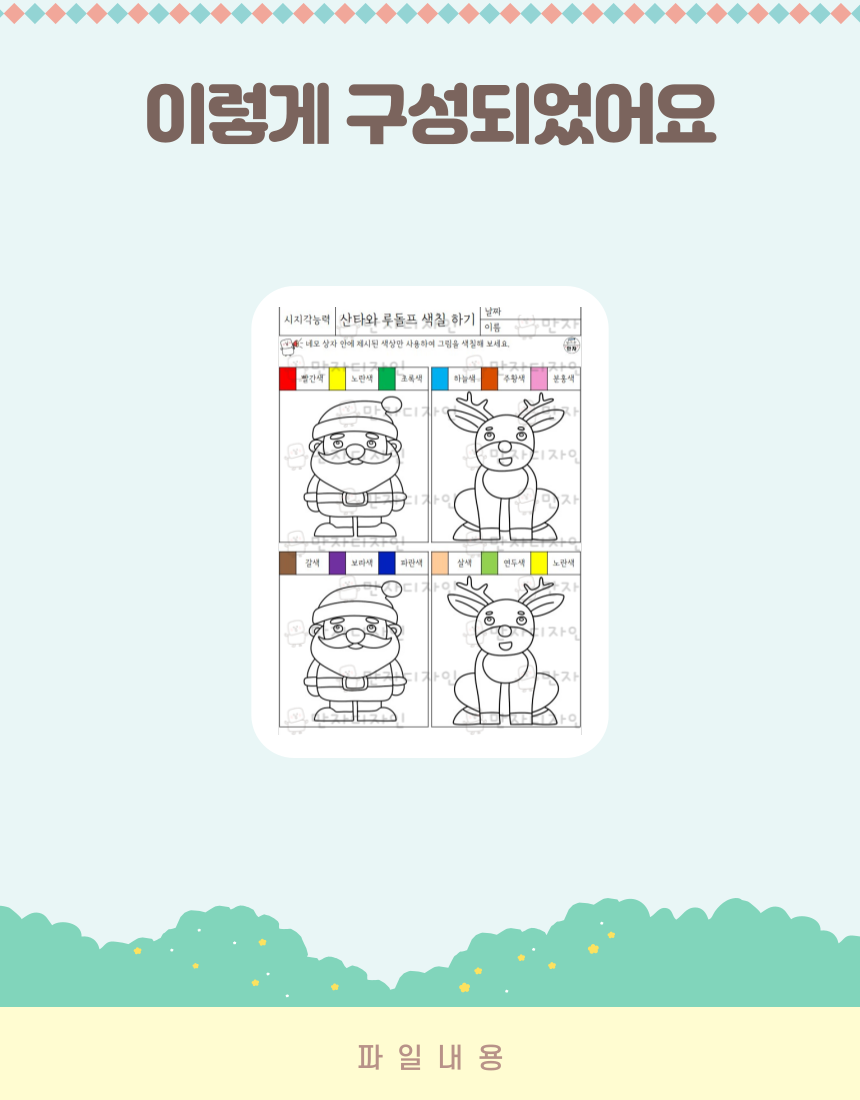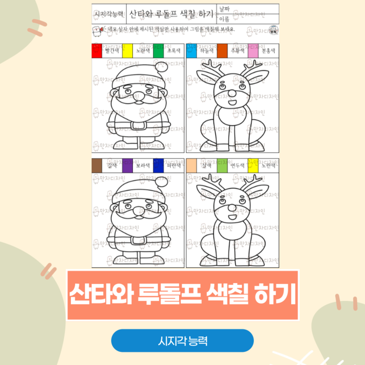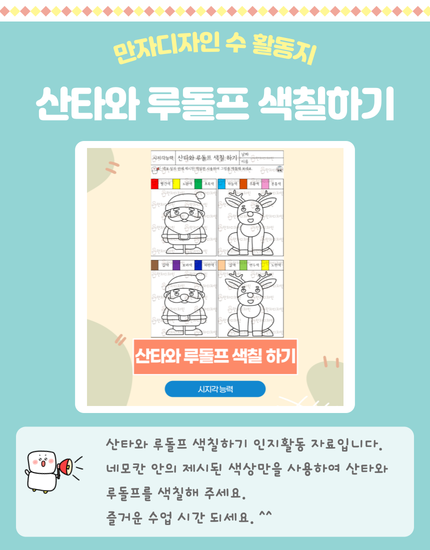 산타와 루돌프 색칠하기, 산타할아버지 활동지, 크리스마스 활동지, 성탄절, 겨울 인지활동, 수 활동지, 색깔 놀이